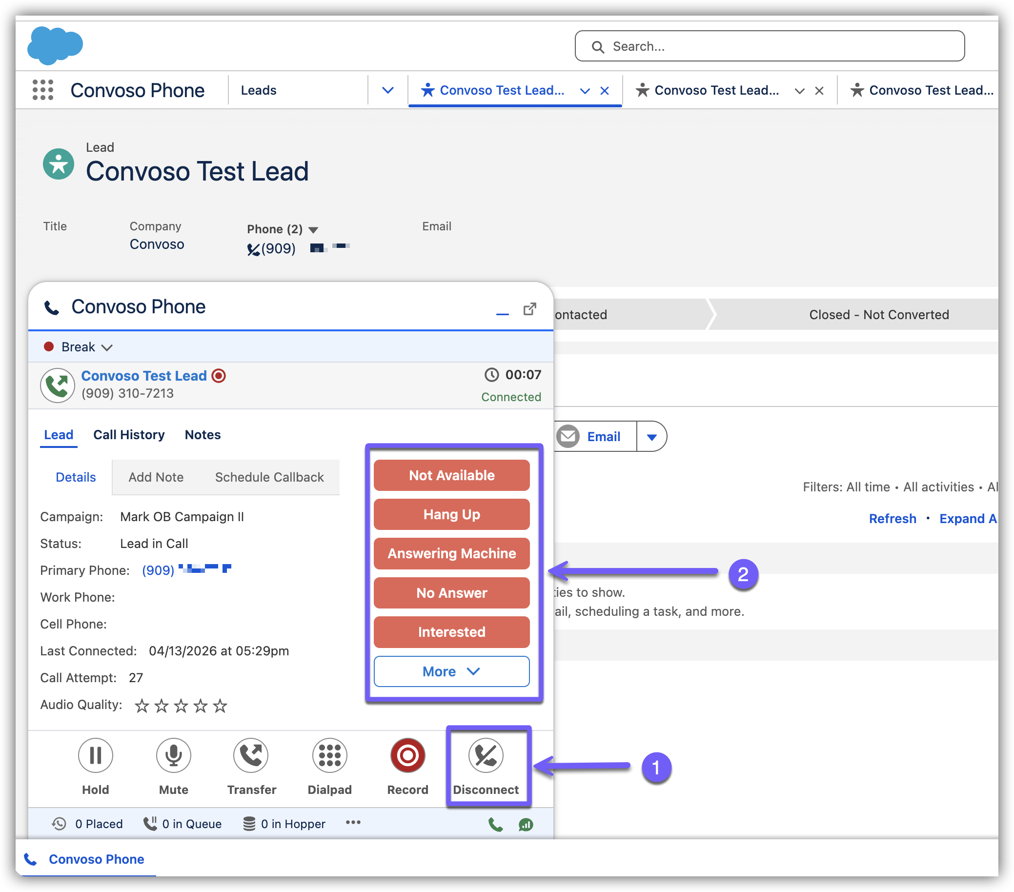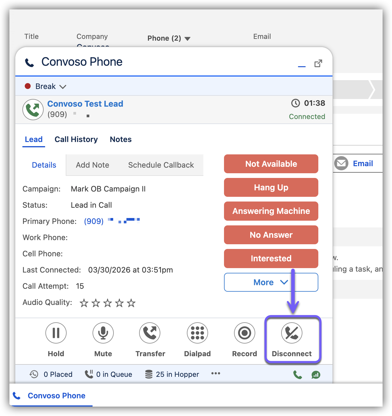 Click on a Disposition and the call will wrap-up and the Lead Record will close.
