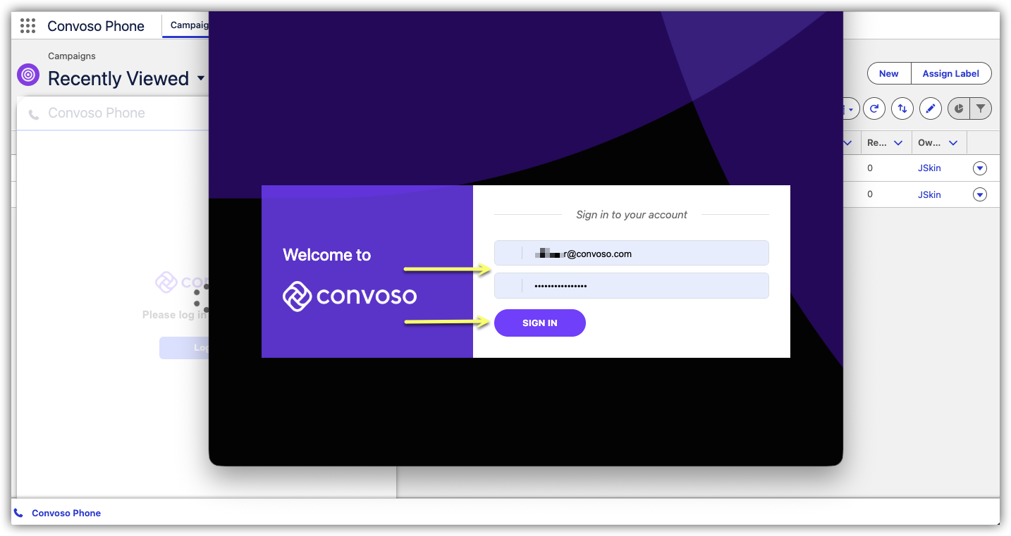 A separate Convoso login window or tab will open. 4.) Enter your Convoso Agent credentials in the username/email and password fields. |