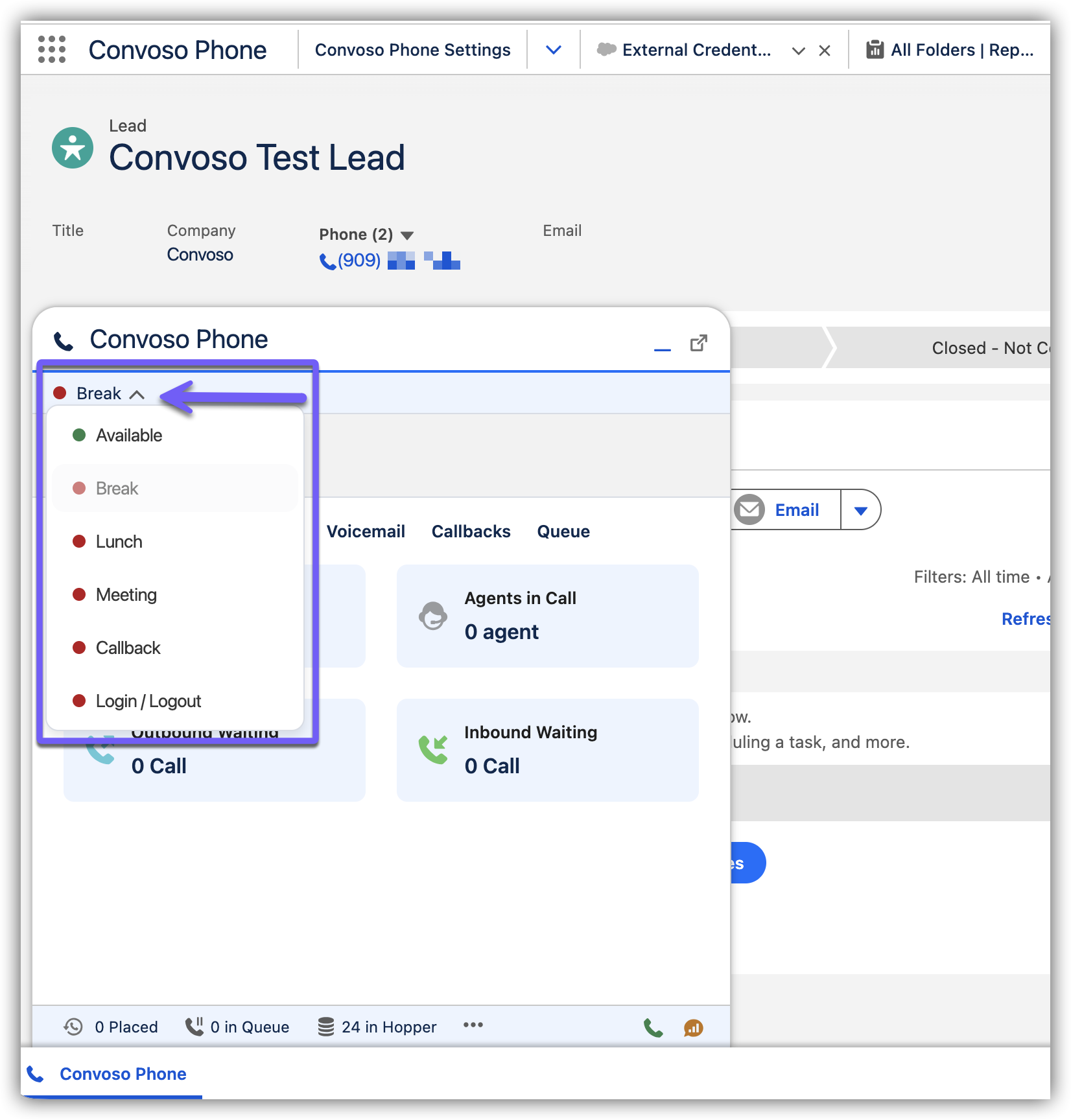 After successful login, the user is returned to the Convoso Phone adaptor window in the browser.