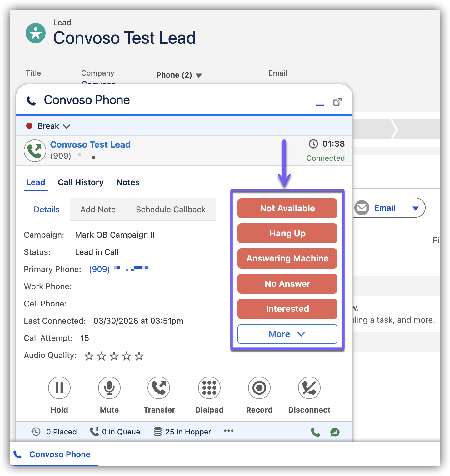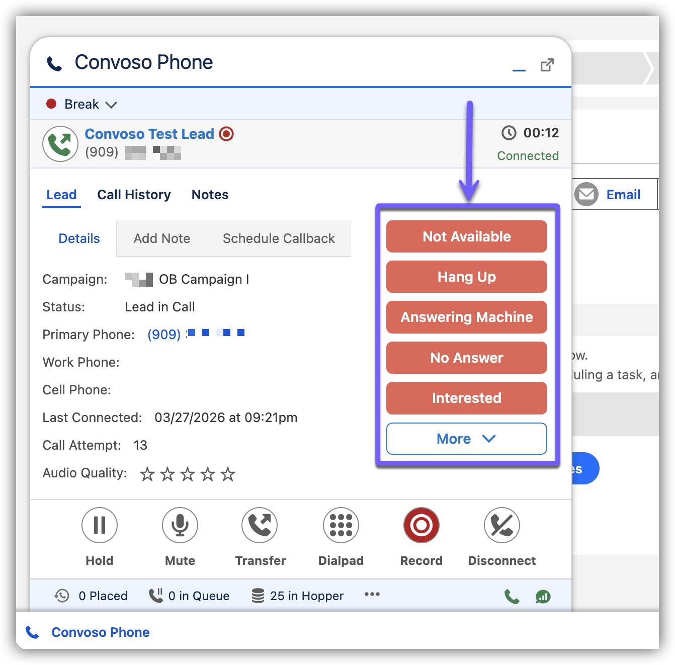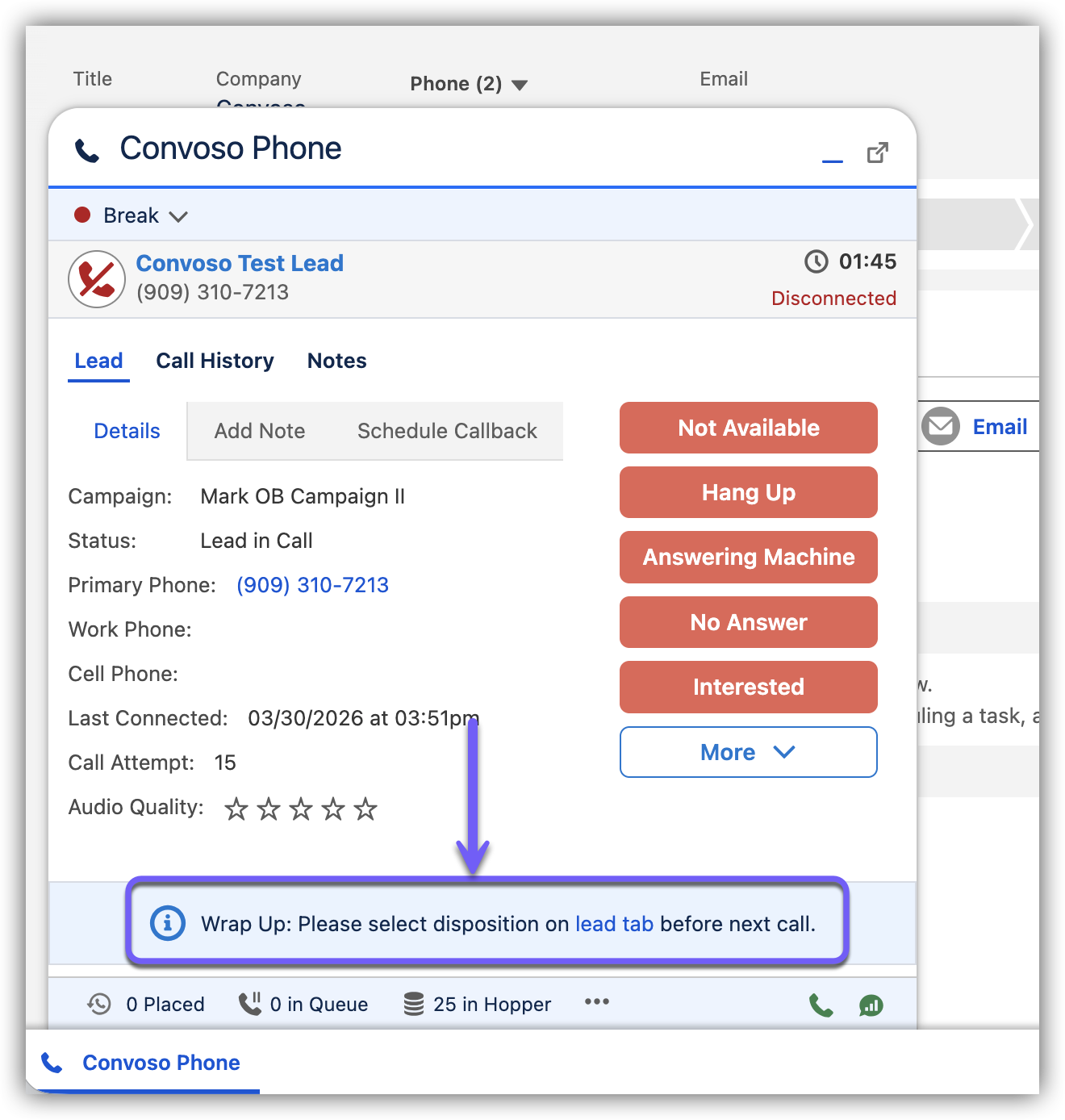 After each call, the softphone will prompt for a Disposition. Dispositions determine the status of the call and trigger CRM activity updates. The available Dispositions for a call depend on what Dispositions are set up by the Admin and mapped from Convoso.