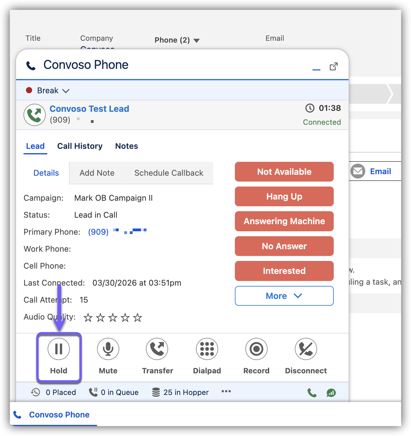 During a call there are several control buttons along the bottom of the Convoso Phone for handling each call appropriately.