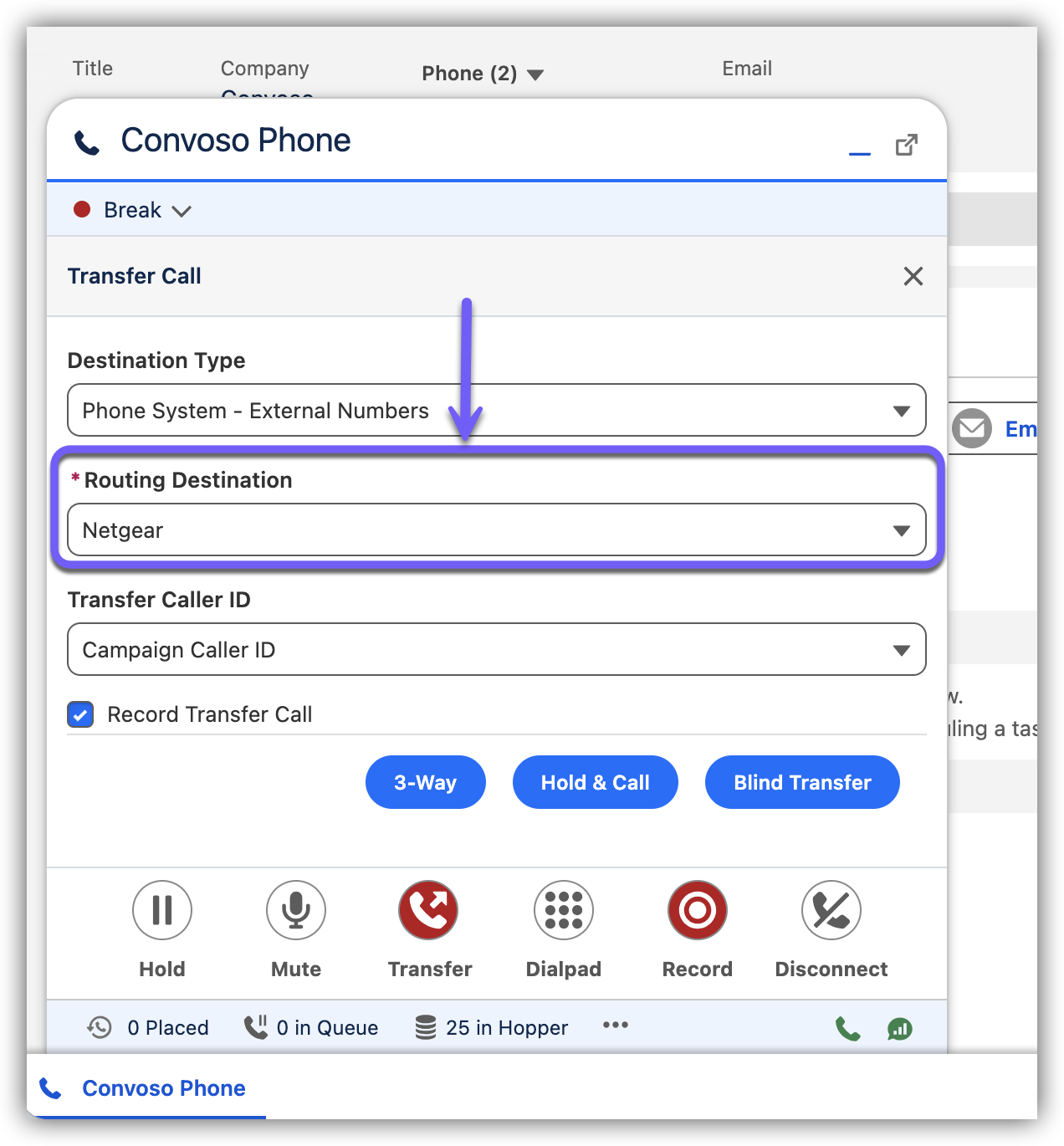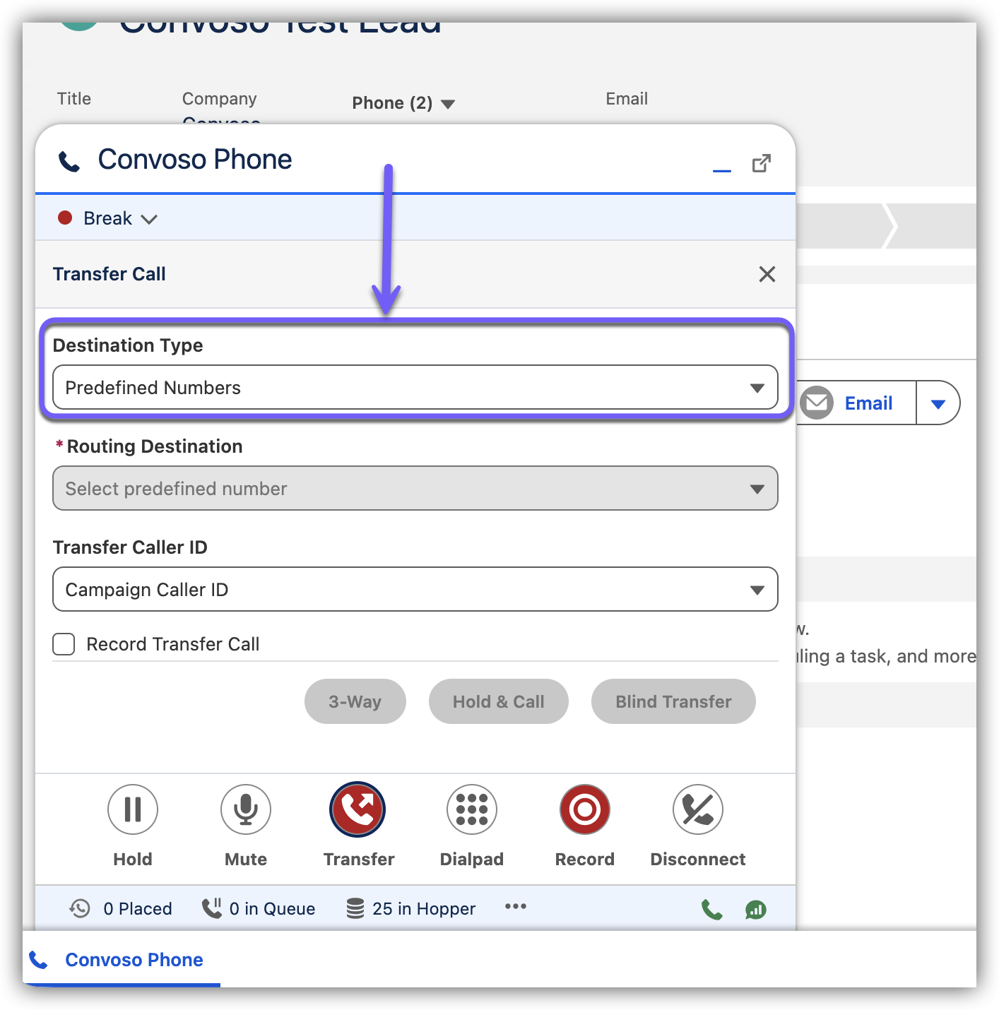 | In the Transfer Call window, select a Destination from the Destination Type drop-down. |