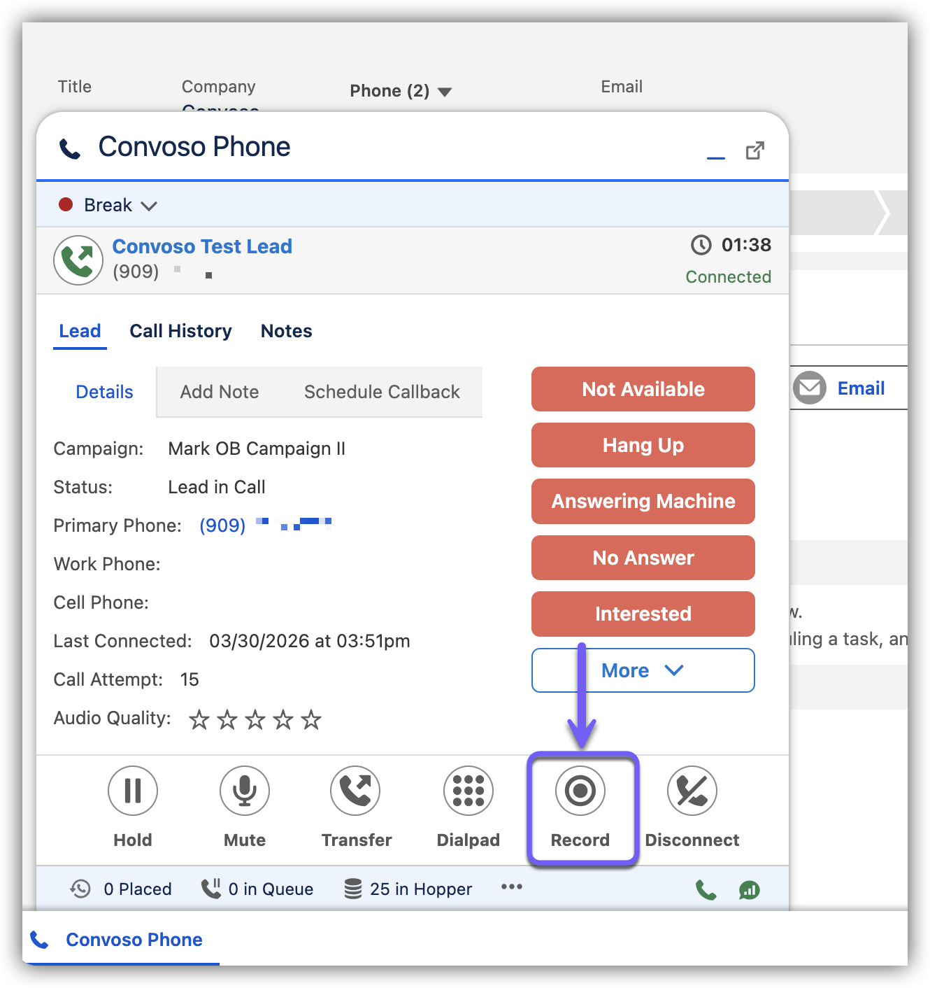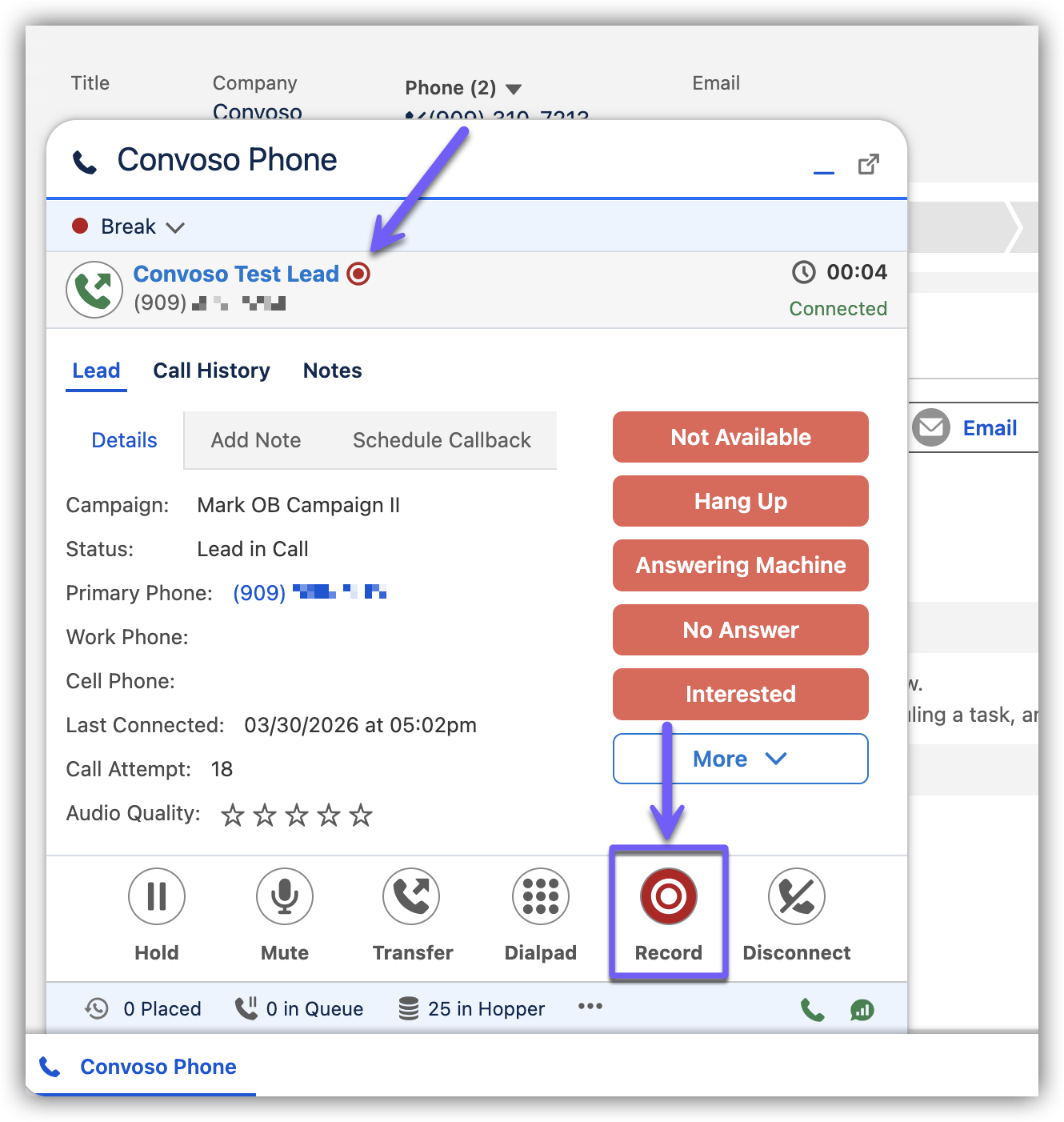 If the call is being recorded, a Recording icon will display next to the Lead name once the call is in progress.