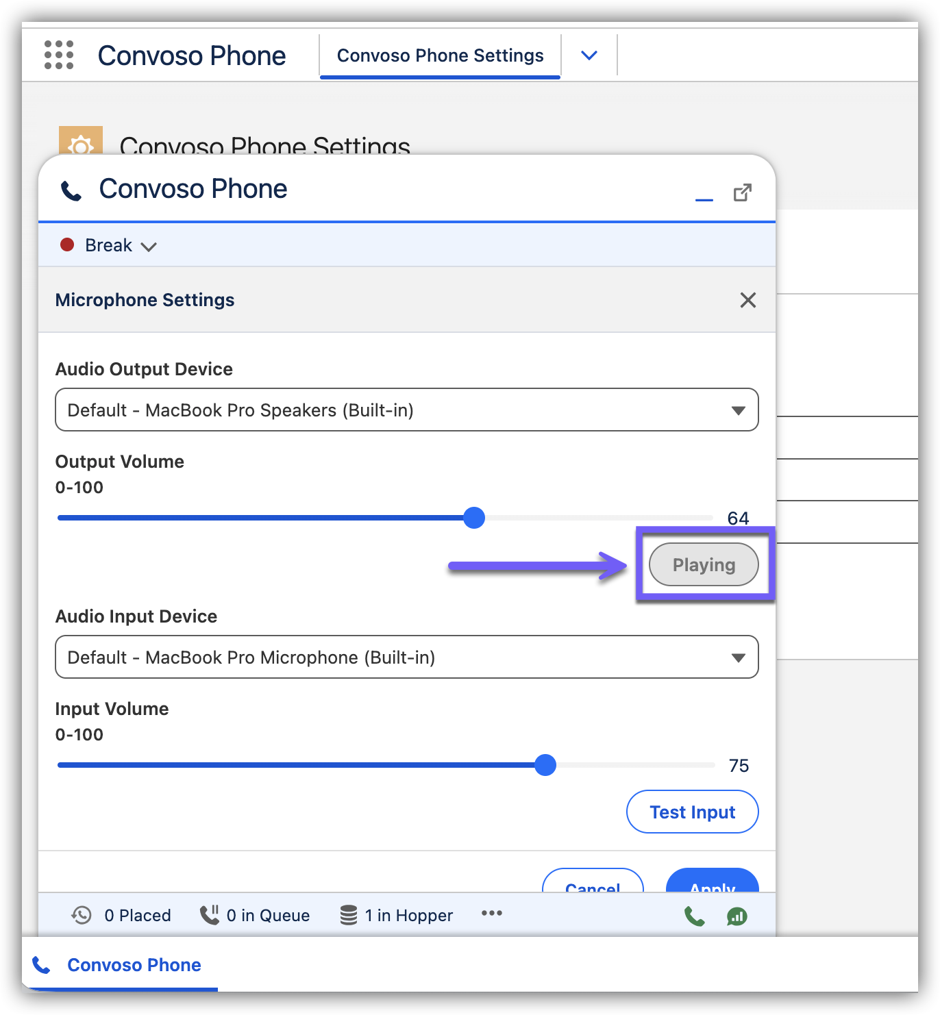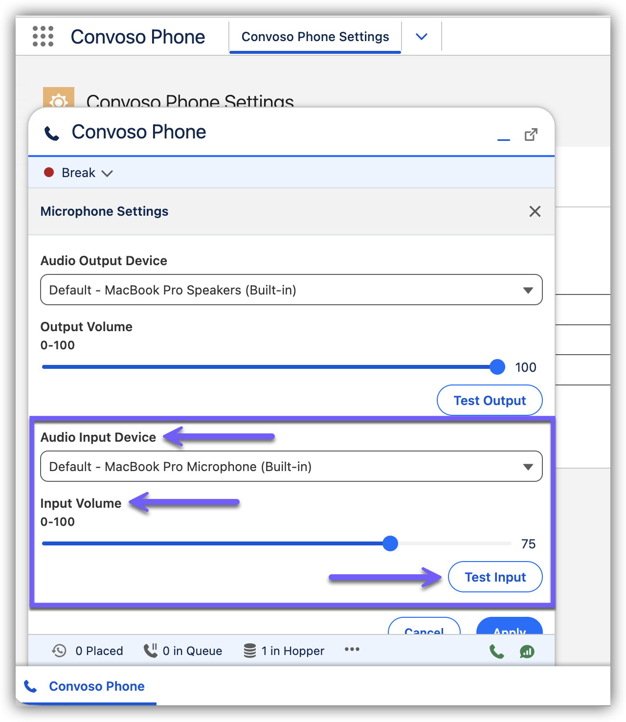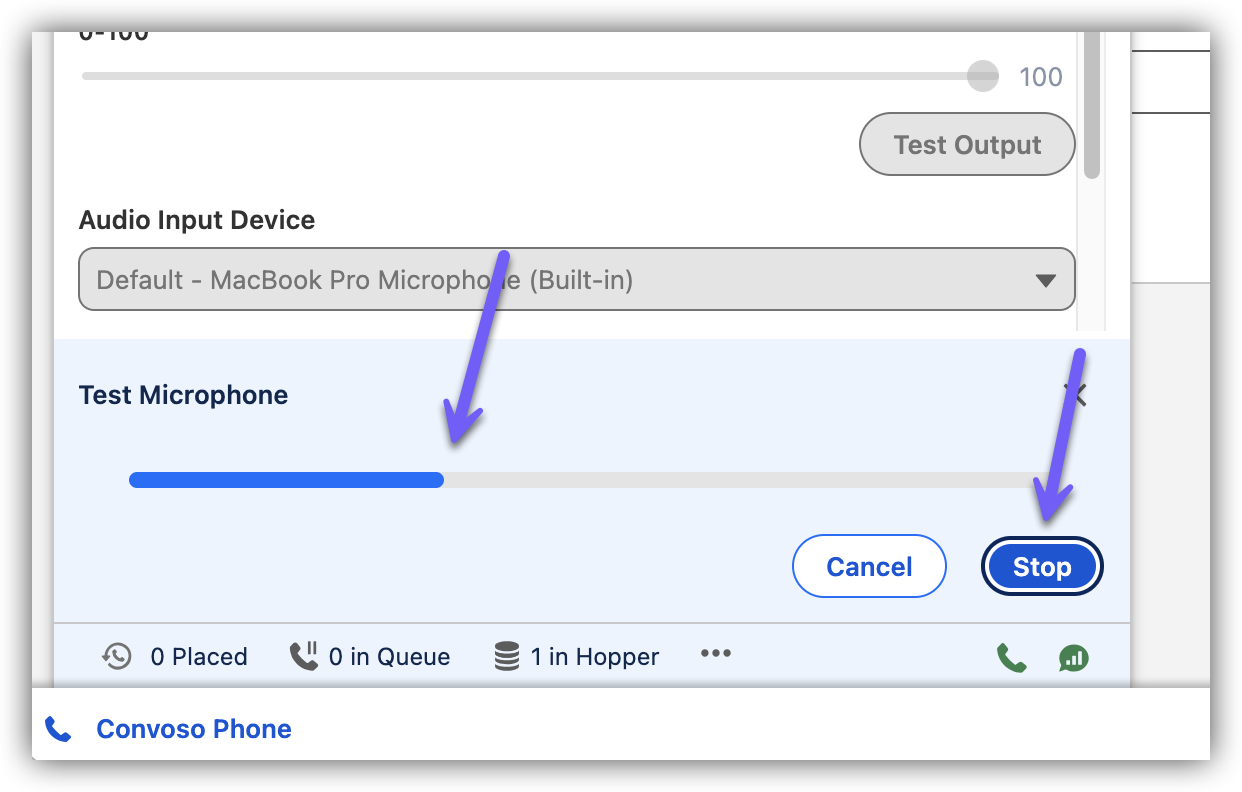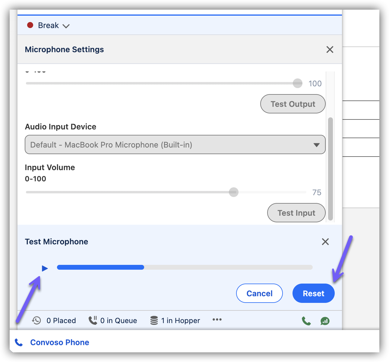 Audio Input Device is the microphone the agent speaks into. Select the Audio Input Device from the drop-down. |