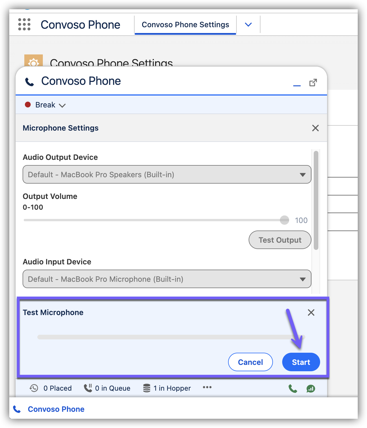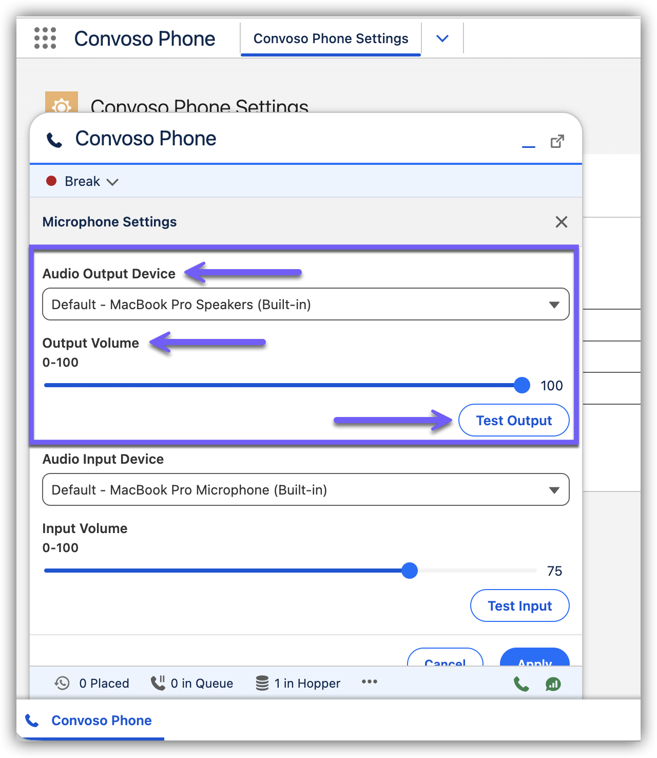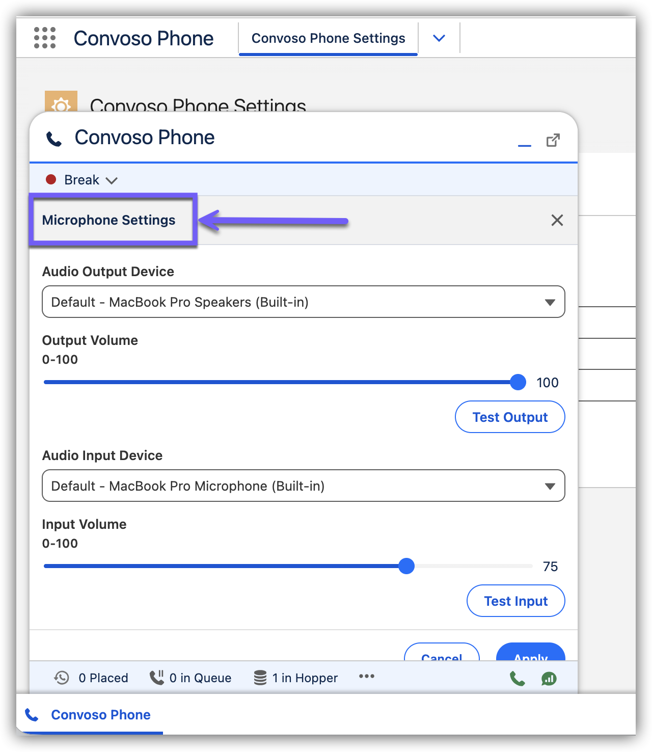 Audio Input Device is the microphone the agent speaks into. Select the Audio Input Device from the drop-down. |