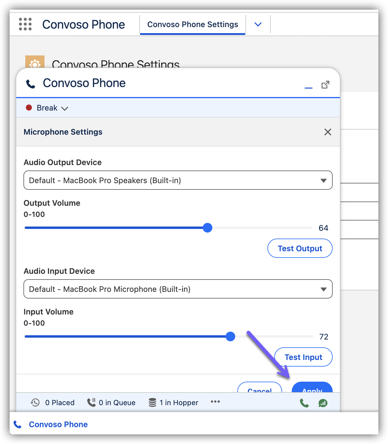 | Click the Apply button so save the input and output Audio device selections and volume levels. |