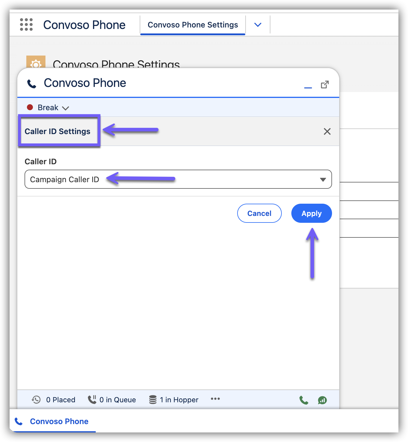 From the Caller ID drop-down select the Caller ID then click the blue Apply button. |